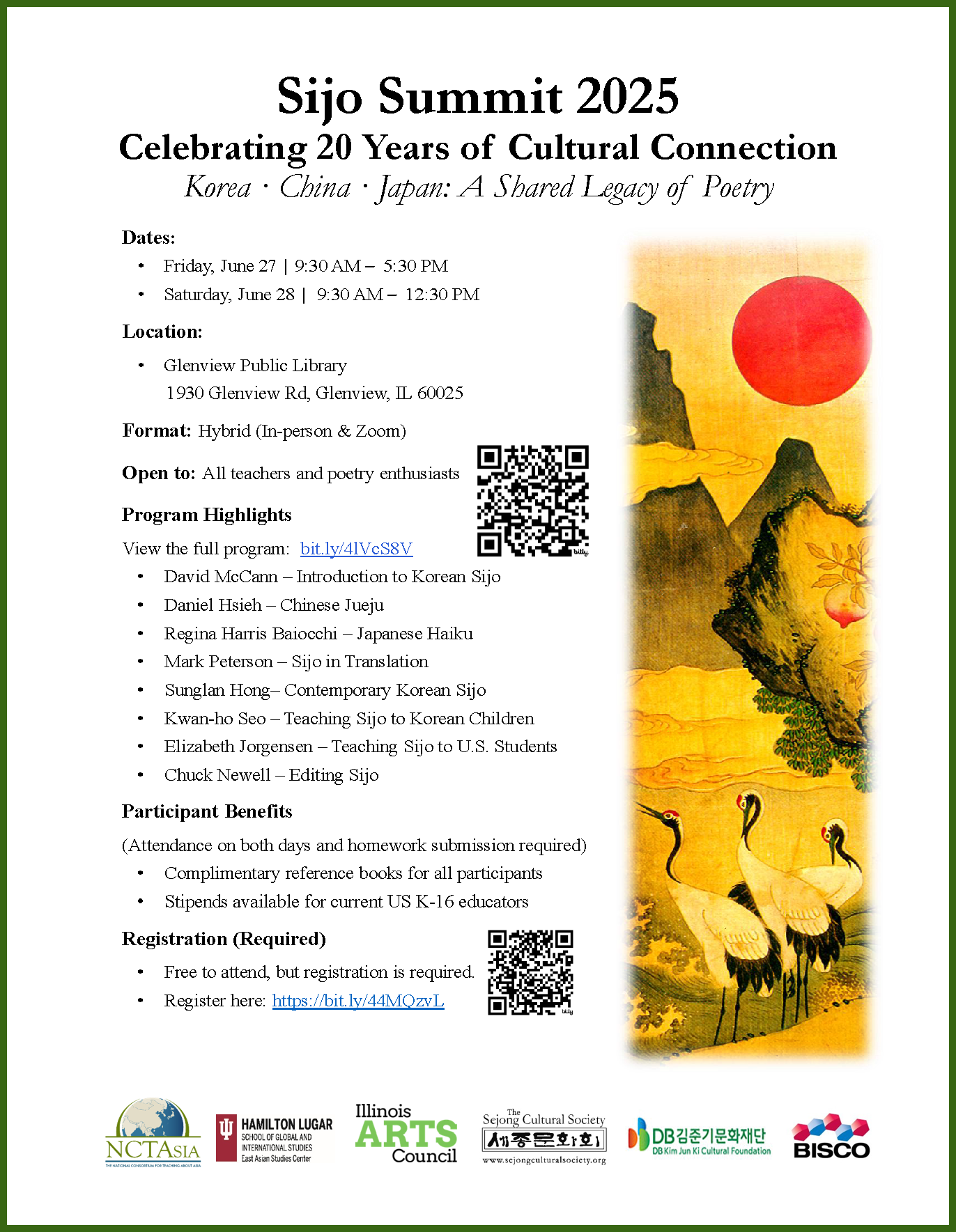 • Current K–16 educators in the U.S. who attend all sessions in person on both days and submit all assignments (a sijo lesson plan and one original sijo) by June 28, 2025, will qualify for a $100 stipend and a travel grant.